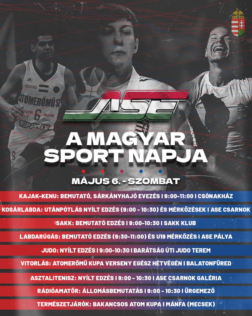 Az Atomerőmű Sportegyesület szakosztályainak szakemberei sok szeretettel várják a sportolni vágyó fiatalokat május 6-án a plakáton feltüntetett időpontokban és helyszíneken a Magyar Sport Napja alkalmából szervezett nyílt edzéseken és versenyeken.